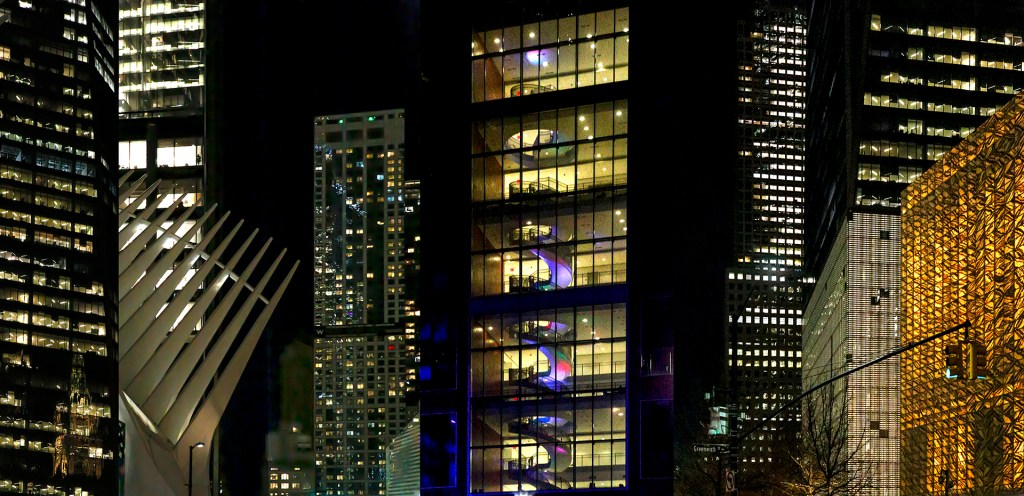 De grandes baies vitrées laissent un peu passer les mystères de l’intérieur, surtout, elles renforcent par leurs reflets l’aspect glacé de l’édifice. Y alternent les paysages du port et la renaissance d’une capitale en plein essor.