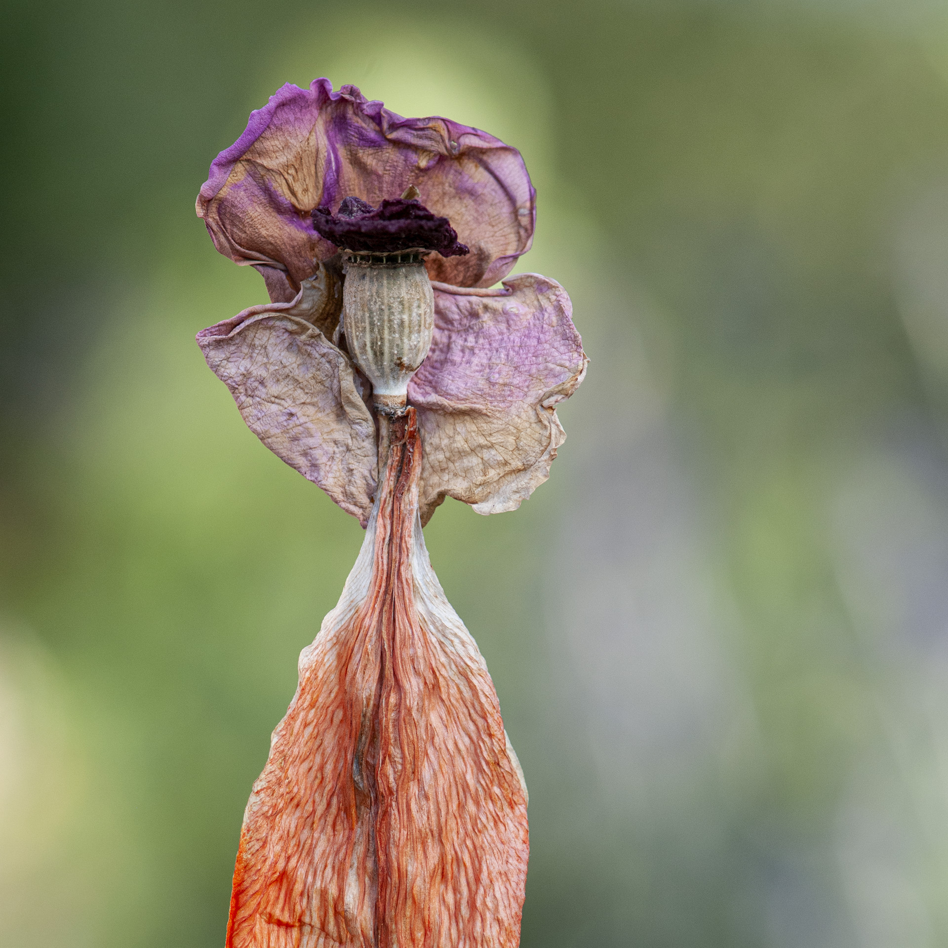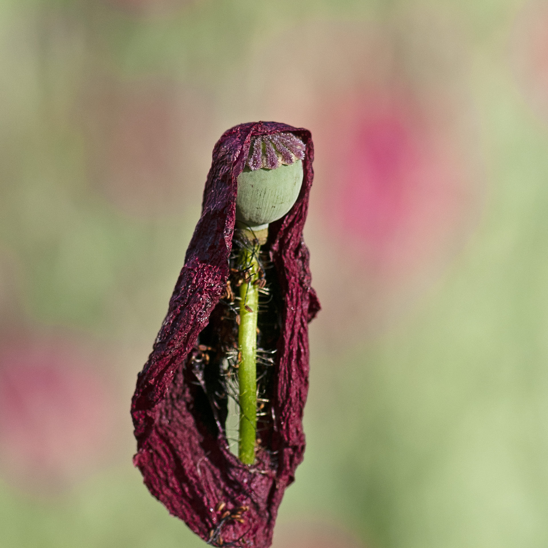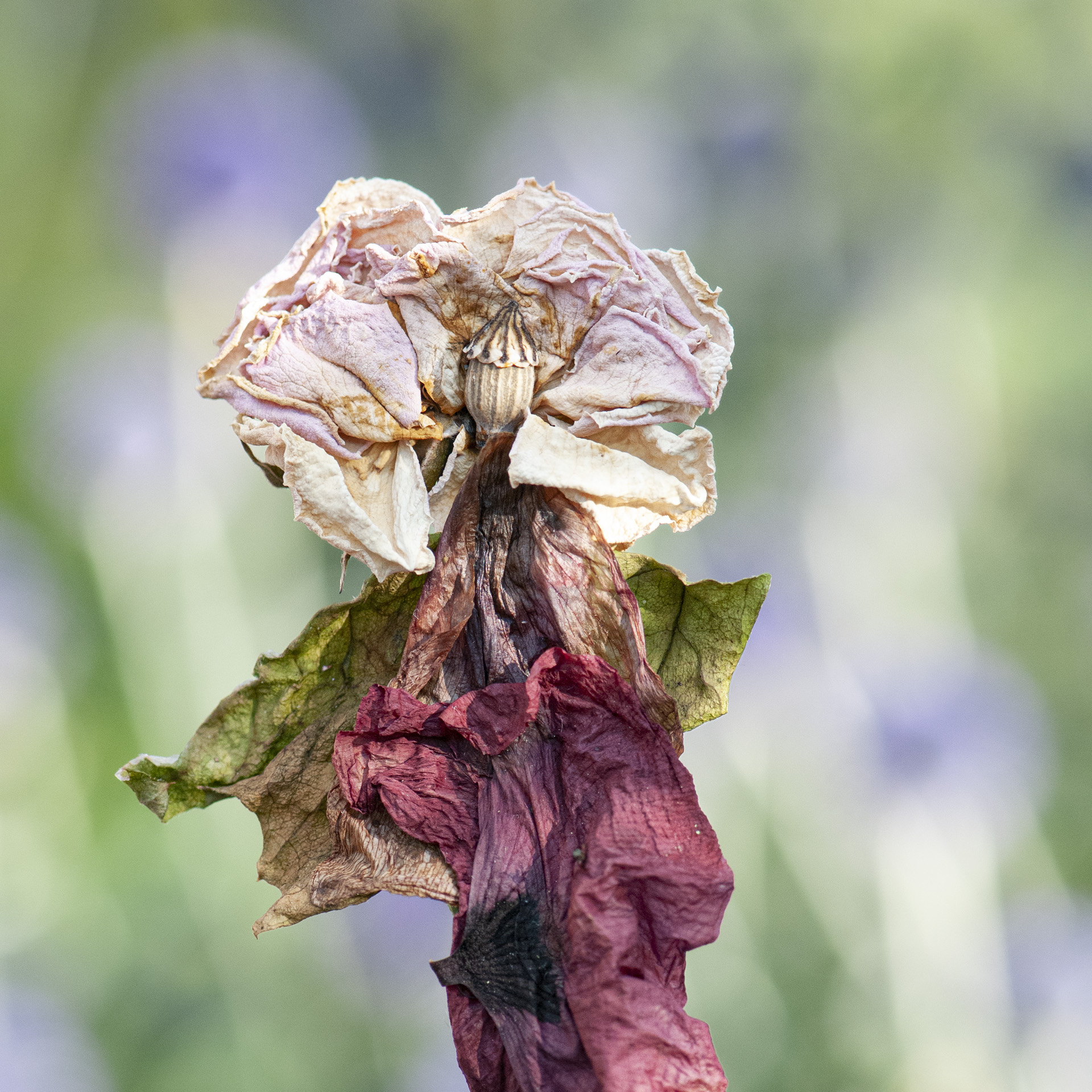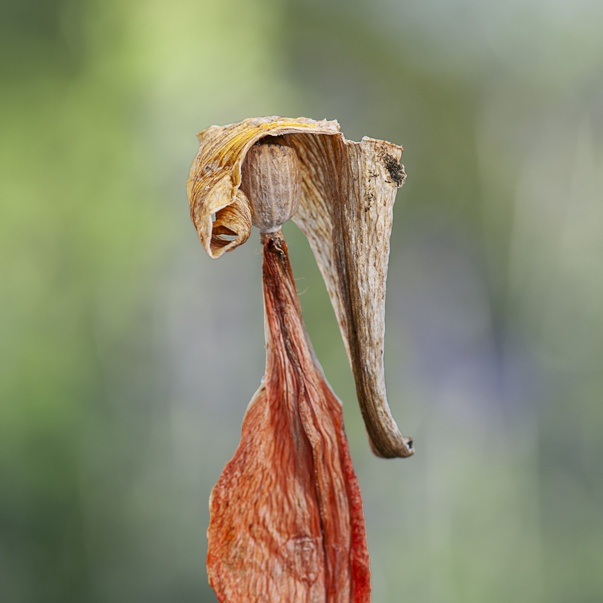 La tige d’un coquelicot ayant conservé ses pétales a donné naissance à une nouvelle fleur originale dans laquelle j’ai perçu un personnage.