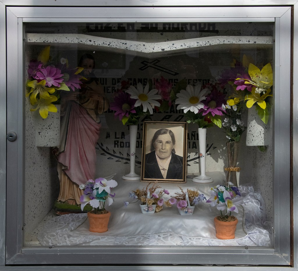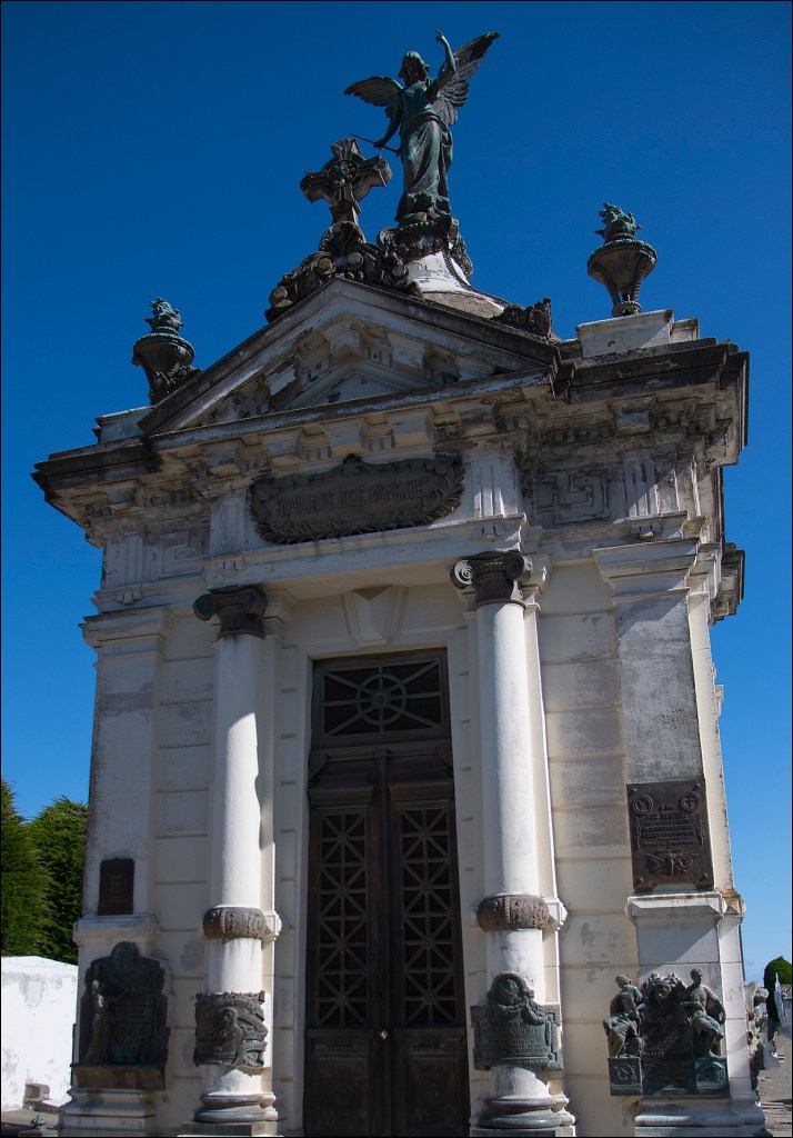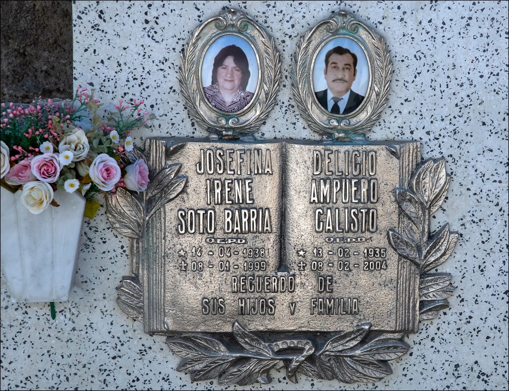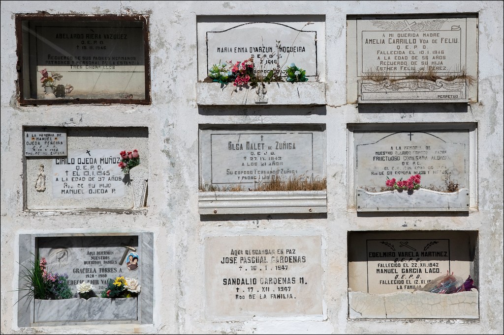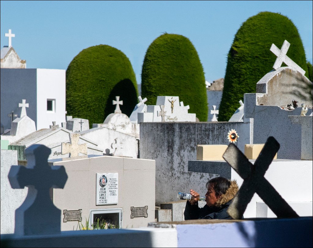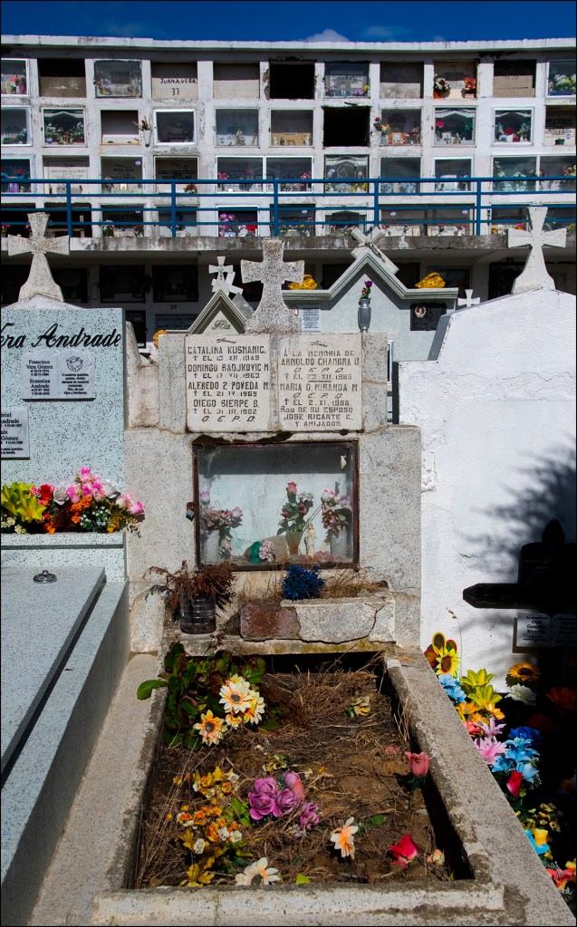 Le cimetière de Punta Arenas se trouve au Chili, il date de 1894. Construit par les riches propriétaires et éleveurs venus d’Europe au 19ème siècle, on y retrouve bien les mêmes différenciations sociales que dans la vie. Les tombeaux somptueux d’immigrants au Chili qui sont venus y faire fortune en faisant travailler pour des faibles salaires les Chiliens, se retrouvent dans les mêmes secteurs, avec des quartiers par pays d’origine. Les tombes très simples des ouvriers Chiliens sont repoussées sur les côtés et au fond de ce cimetière. En s’y promenant on ressent bien cette sectorisation et ces différences de niveau de vie entre des classes hyper riches, et des gens extrêmement pauvres, Les caveaux somptueux sont dans des parties arborées et large. Le reste du peuple se retrouvent dans des mini-emplacements de 40 sur 40 cm, qui sont sur les bords de ce cimetière, et sont construits en forme de HLM. On ressent bien la promiscuité entre les personnes pauvres et les personnes de l’aristocratie Chilienne depuis le 19ème siècle. Il n’est pas facile en une douzaine de photos de faire ressentir ce sentiment que l’on remarque bien quand on s’y promène, j’espère avoir réussi à le faire un peu. Les Chiliens ont un rapport proche avec leurs morts, ils entretiennent leurs petits caveaux HLM, ils possèdent une porte vitrées à l’avant qui ferme à clé, et en général à l’intérieur ils y mettent tous les objets que le défunt adorait, ainsi que ce qui avait trait à ses passions dans sa vie ou son métier….